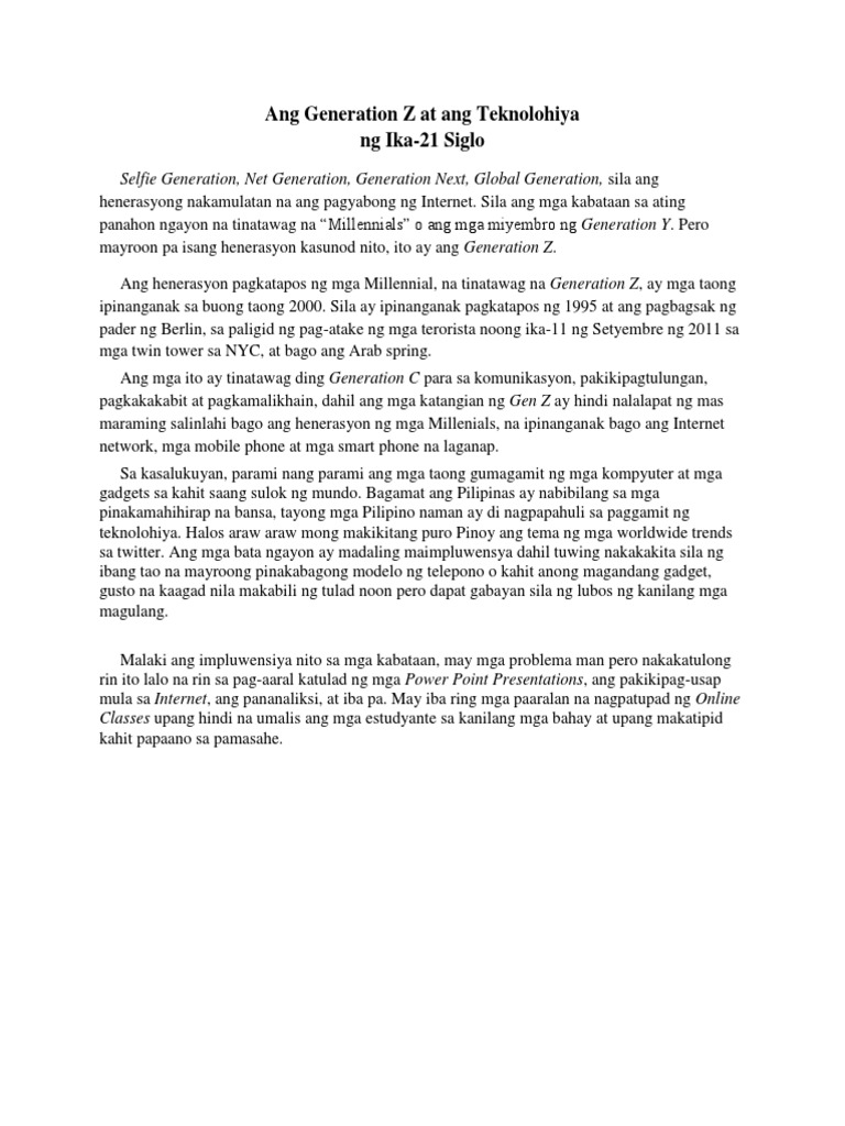 Generation Z ipinanganak sa taong. Gayundin sila ay nakatuon sa pag-iibigan nakatuon sa pag-unlad hinihimok na gumawa ng pagkakaiba at motivated ng. Pagkakaroon ng positibo o negatibong epekto ng online class sa mga.