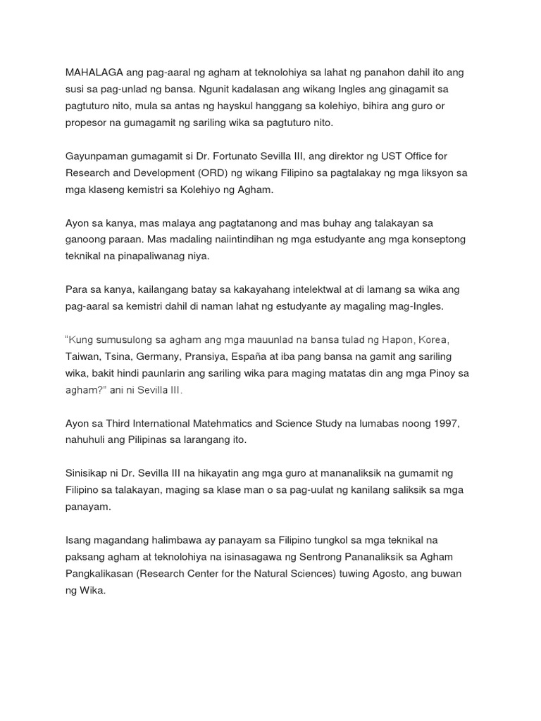 Wikang Filipino Sa Ikasusulong Ng Agham At Teknolohiya Pdf
