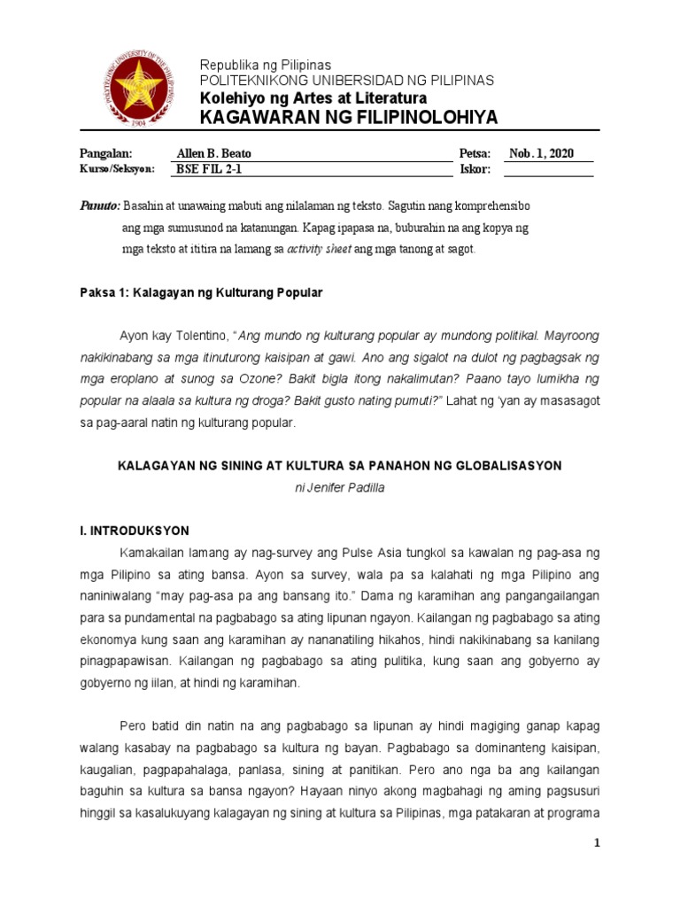 Final Written Kulturang Popular Docx Republic Of The Philippines Tarlac State University College Of Education Center Of Development Lucinda Campus Course Hero