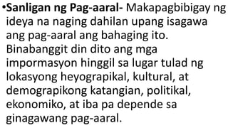 Binabanggit din dito ang mga impormasyon hinggil sa lugar tulad ng lokasyong heyograpikal kultural at demograpikong katangian politikal ekonomiko at iba pa depende sa ginagawang pag-aaral. Ito ay nahahati sa dalawang bahagi. Pag-a a ral noun study.