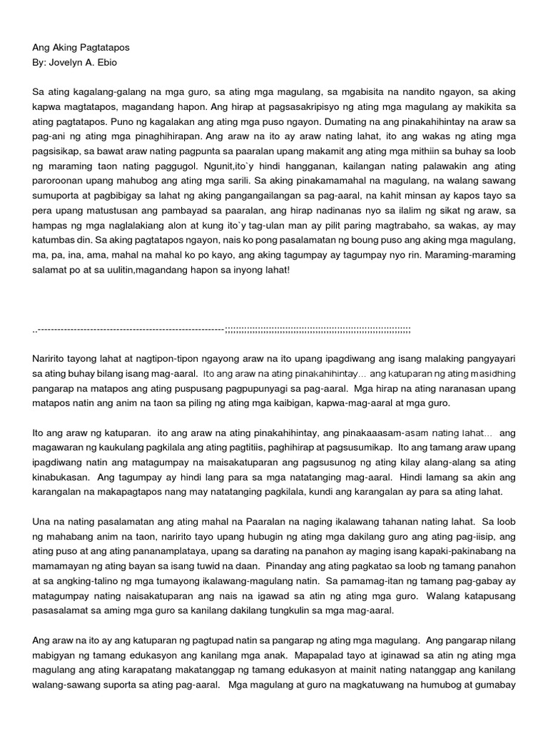 Mas malawak na mundo ng oportunidad. 2Talumpati sa Pagtatapos commencement speechna kadalasang binibigkas ng natatanging mag-aaral na may pinakamataas na grado o pinakamatagumpay sa klase tuwing pagtatapos. Talumpati Tungkol Sa Pag-aaral.