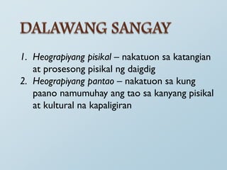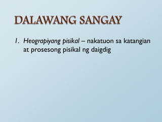 Tumutukoy sa siyentipikong pag aaral ng katangiang pisikal ng daigdig. Ito ang ay tumutukoy sa siyentipikong pag-aaral ng katangiang pisikal ng daigdig. Katangian ng kinaroroonan tulad ng klima anyong lupa at tubig at likas na yaman. Katangian ng mga taong naninirahan tulad ng klima anyong lupa at tubig at likas na yaman.