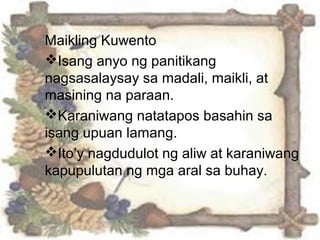 Banghay Ito ay tumutukoy sa pagkakasunod-sunod ng mga pangyayari sa kwento. Kariktan- maririkit na salita upang masiyahan ang mambabasa gayon din mapukaw ang damdamin at kawilihan. Ano- ano ang katangian ng isang mabuting mag- aaral.