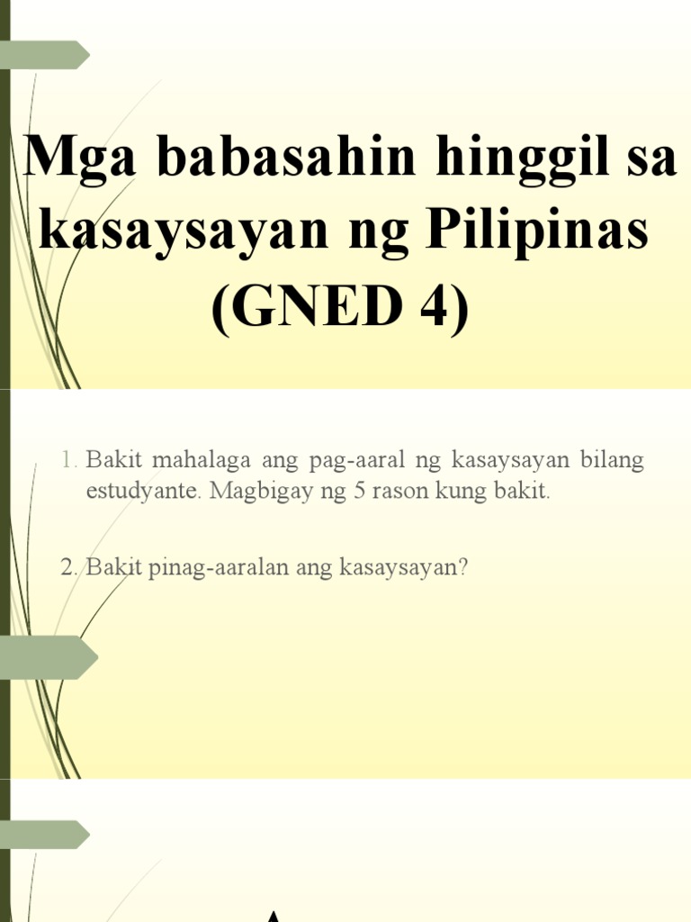 Kahalagahan ng pag-aaral Kasaysayan Pinupukaw nito ang ating damdaming makabayan at makatao. Tipikal na tinutukoy ng salitang ito ang mga pangyayaring nakatala. Subalit ang ganitong tagumpay ng wikang Filipino ay hindi naging madali gaya ng.