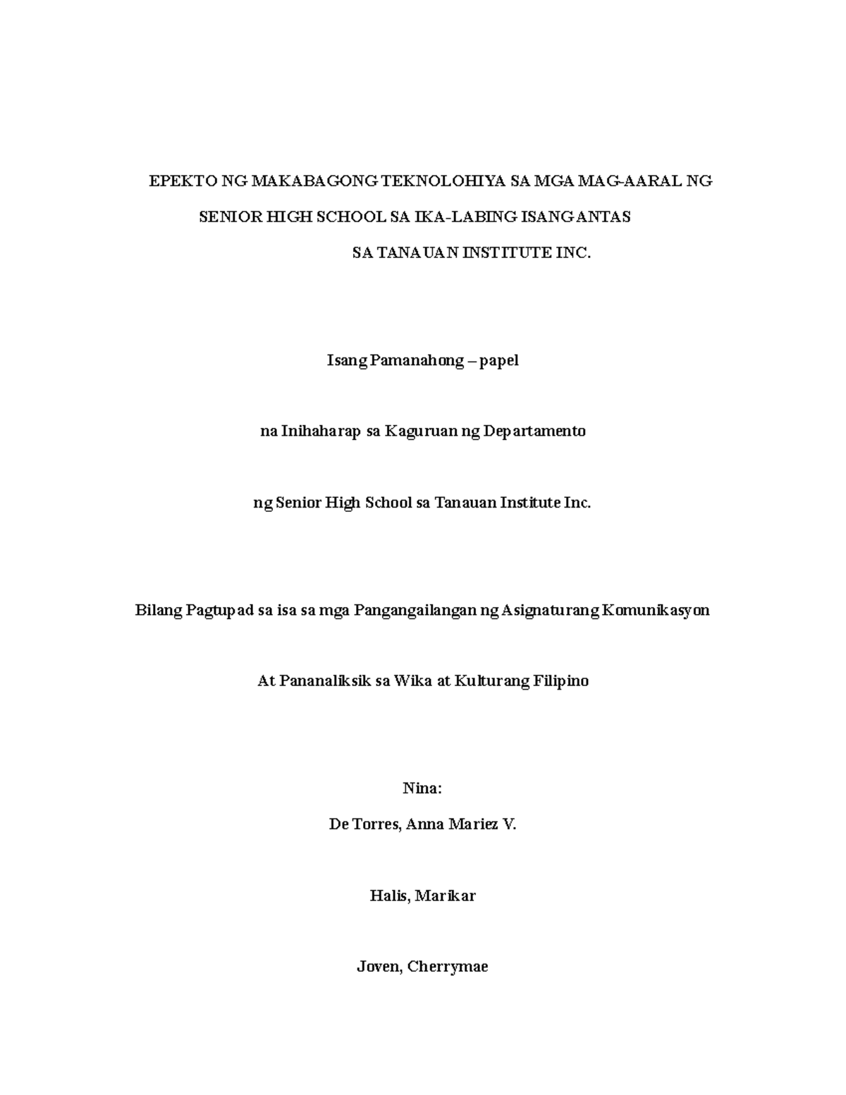 Ang pag-aaral na ito ay nakapukos sa epekto ng teknolohiya sa mga mag-aaral ng grade-11 B HUMSS. Kaya naman maaari tayong makagawa ng mas mabuting komunidad at lipunan dahil sa pagiging edukado at pag respeto sa mga batas at sa mga karapatang pantao. Masabi natin na napakaraming naitulong ang teknolohiya sa ating buhay lahat ng sector sa ating komunidad ay nadama ang kahalagahan ng mga makabagong teknolohiya sa pang araw- araw na pamumuhay.