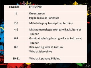 Vina Paz Unang Semestre 2009-2010 INTRODUKSYON Ang usapin ng isang pambansang wika sa Pilipinas ay lubhang. O dili kayay yaong katawagan sa ating wikang pambansa bago ito pinalitan ng Filipino ayon sa ating saligang. Nagiging batayan din ng pag-aaral ang mga maeryal at di-materyal na bagay tulad ng kasuotan tirahan paniniwala at pagpapahalaga.