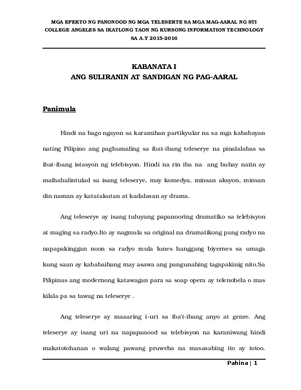 The study was conducted during the school year 2021-2022. Share Kabanata I Suliranin at Saligan ng Pag-aaral. Dahil sa mga resulta na nasa itaas naisipan ng mga mananaliksik na pag- aralan ang ibat-ibang katangian ng isang teleserye na pinapanood ng mga mag-aaral ng Gensantos Foundation College Inc.