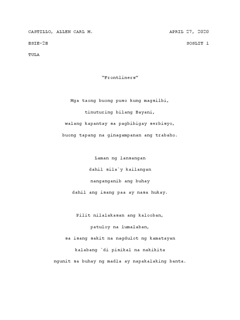 Ang pahayag na ito ay binuo upang mabigyan ng angkop na paliwanag ang tungkol sa mga Tula ng Filipino at para mabigyan kayo nga kaalaman tungkol dito. Tula Ng Isang Mag-aaral. Tula tungkol sa agrikultura o pagiging makatao.